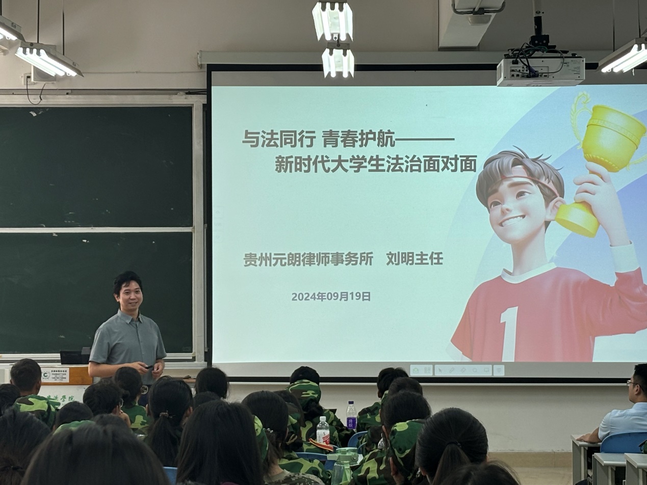 9月19日上午,受betway西汉姆联平台沈雪蓓老师邀请,贵州元朗律师事务所主任、资深律师刘明在3188教室为2024级94名新生作了题为《与法同行 青春护航——新时代大学生法治面对面》的专题讲座。