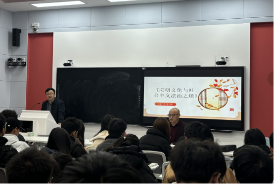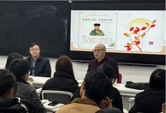 两位老师在教学和科研领域均有建树。龙浩是“运用‘智慧教室’提升《思想道德与法治》合作学习效能的实践探索”思想政治理论课教育教学改革研究项目的负责人,任健是阳明学与黔学研究院的青年教授。两位老师携手就《思想道德与法治》课程第六章的内容进行了“理论二人讲”。授课主题是“阳明文化与社会主义法治之道”。值此“宪法日”,两位老师从阳明心学的“致良知”引导同学们共同探讨社会主义法治之道,探寻国家治理体系与治理能力现代化的实现路径及方法。