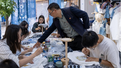 最后,枫香染非遗传承人讲解枫香染一系列的描画、浸染、漂洗制作工艺,通过亲身体验,同学们对枫香染非物质文化遗产的感知和理解以具体的形式表现出来,不仅加深了对传统文化的认识,也体验到了枫香染传统技艺的魅力所在。
