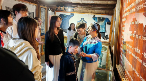 师生一行首先前往“中华布依第一堂屋”学习布依族民俗文化。中华布依第一堂屋修建于清道光年间,是目前布依族风格保存得最为完整的古居民建筑。通过堂屋建筑结构、生产生活工具、礼仪文化等,同学们感受到布依族独具特色的民族文化。同时,师生还一同学习了以诗词形式展现的布依族廉洁文化。