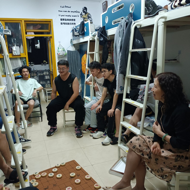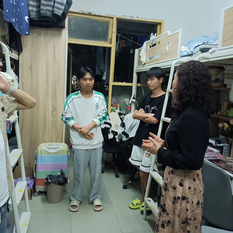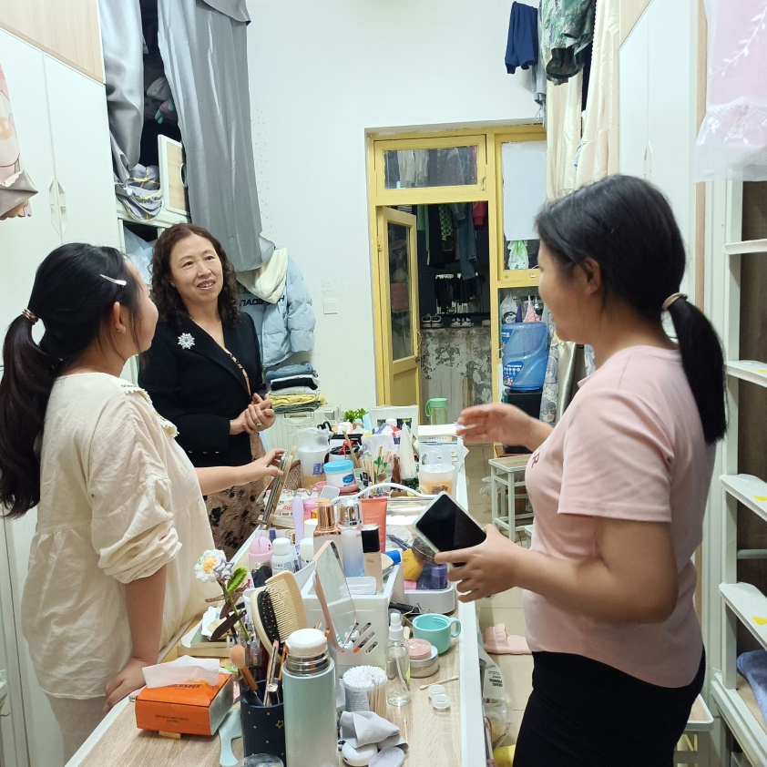 在大一、大二学生寝室,何老师亲切地询问同学们能不能适应大学的学习生活?在学习上有没有什么困难?专业知识是否能够理解掌握?她鼓励大家要多与老师沟通交流,同学之间要互帮互助,为学习发展创造和谐美好的寝室环境。要明确自己的学习目标,做一个坚实的行动派,不断充实自己,提高自己,增强自身的竞争力,为自己四年美好的大学时光交上一份满意的答卷。