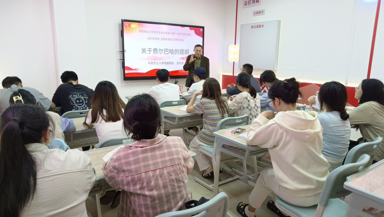 本次读书分享会共分两个环节。首先,龙叶先围绕马克思的《关于费尔巴哈的提纲》(以下简称《提纲》)进行阅读分享。他强调,在《提纲》一文中,马克思第一次阐述了实践在哲学中的地位和作用,实践的观点是《提纲》基本观点,实践的思想是《提纲》的灵魂,它像一根主线,贯穿于《提纲》的每一条之中。《提纲》是马克思主义哲学形成过程中的一部极其重要的文献。他指出,作为新时代的大学生,应该培养批判性思维能力,将马克思的理论与实际相结合,善于用理论指导实践。