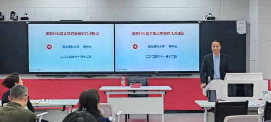 鲍中义首先对近年来国家社科基金年度项目的立项情况及评审程序进行了介绍,并对2024年公示未立项的选题、近年来各学科立项情况以及贵州省立项情况都进行了深入分析,特别统计了2024年国社科立项高频词和西部项目立项高频词,提醒老师们关注和把握立项特点和立项趋势。