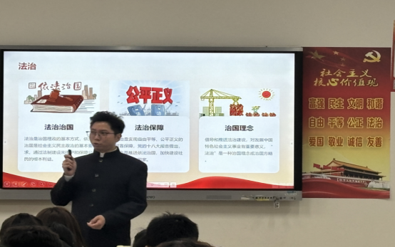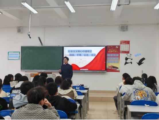 20241121日上午,贵州省元朗律师事务所主任、贵州省优秀青年律师刘明走入思政课堂,与体育学院24级体育教育专业,文化传媒学院24级广编专业,法学院24级法学专业、社工专业的同学一起共话社会主义核心价值观。刘明站在法律人的视角从四个方面阐述了社会主义核心价值观自由、平等、公正、法治之间的辩证关系,强调新时代大学生要自觉主动尊法、敬法、学法、守法,做法治中国建设的坚定拥护者和传承者。